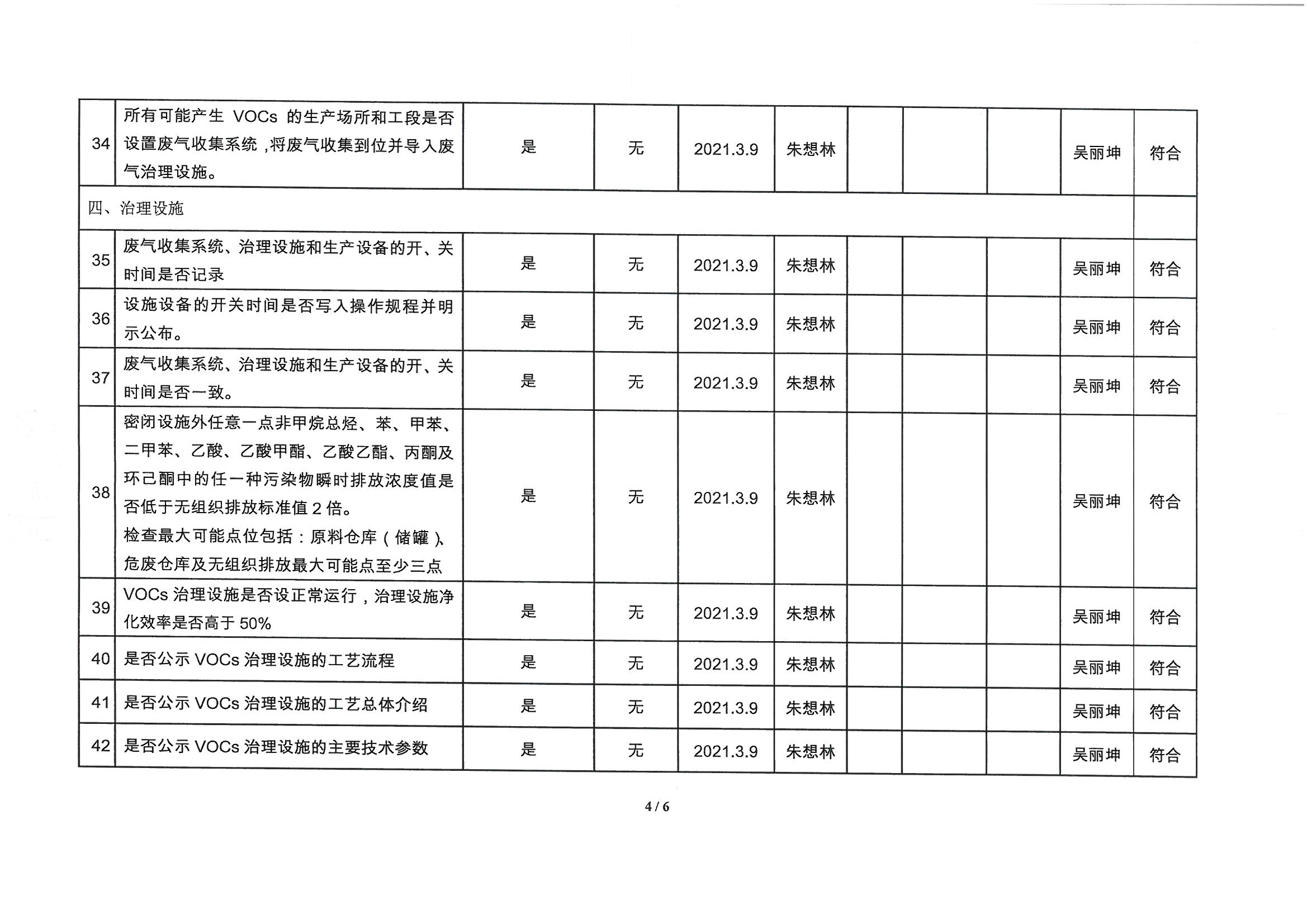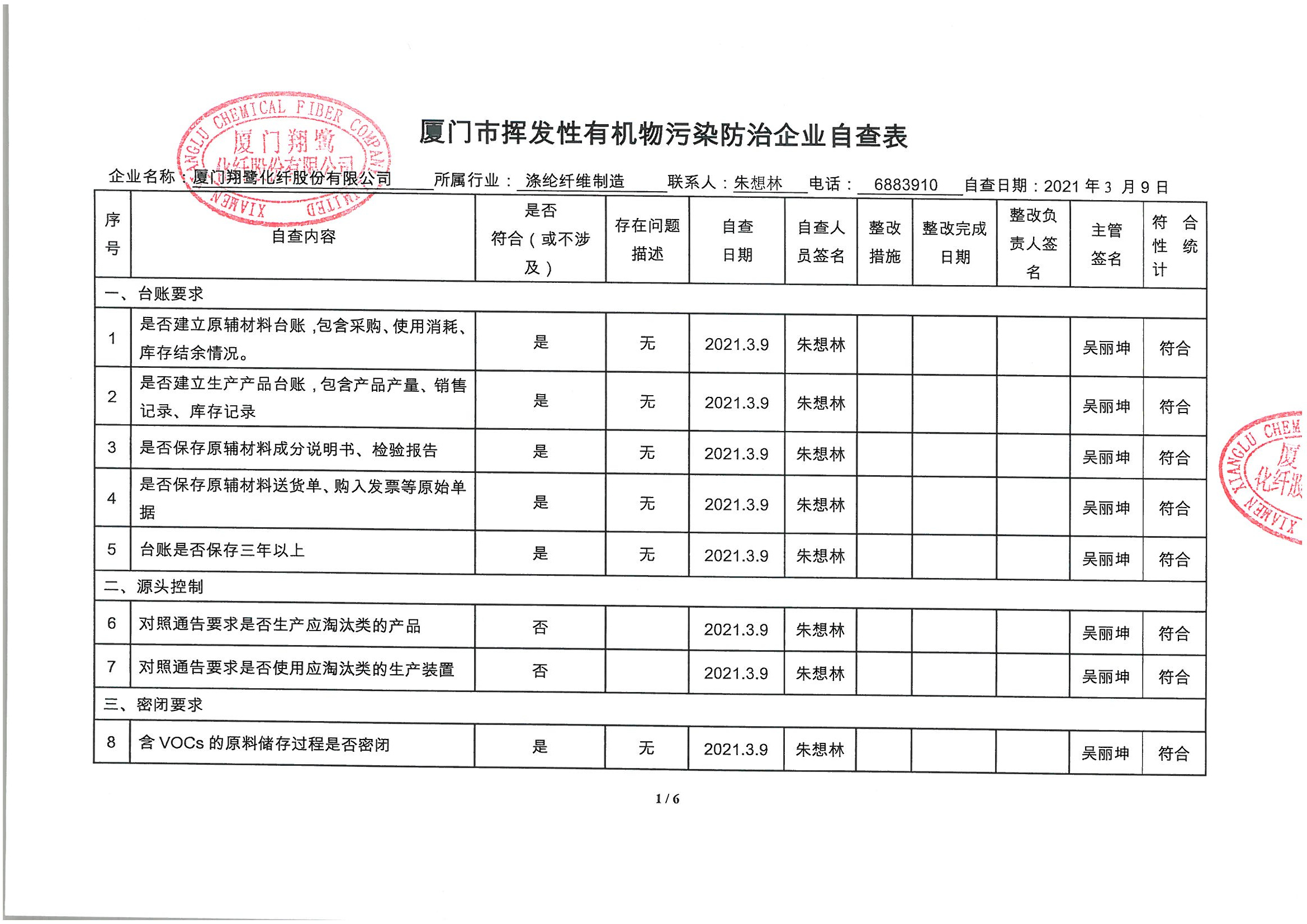 廈門市揮發性有機物污染防治企業自查表 (2021年 第一季度)